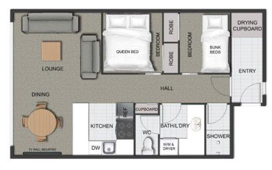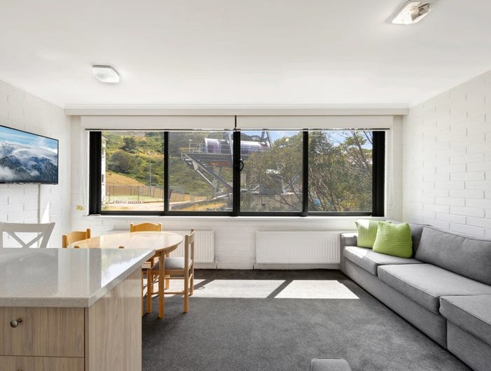 Bedroom 1 contains a Tri Bunk and Bedroom 2 a Set of Bunks. Situated in the Village Bowl this Skyline View, Ground Floor, Fully Self-Contained 2 Bedroom/1 Bathroom Apartment is only a stone throw away from Eagle, Summit and Gully Chairlifts and offers true ski in ski out access in winter! Within walking distance to restaurants, cafes and bars this apartment is also perfectly located for summer activities with the Tennis Courts, Playground, Pump Track, Hiking and Mountain Biking Trails all close by. Complementary Wi-Fi, Fresh White Linen, Towels, L’or Coffee Machine and Toiletries Starter Pack provided.